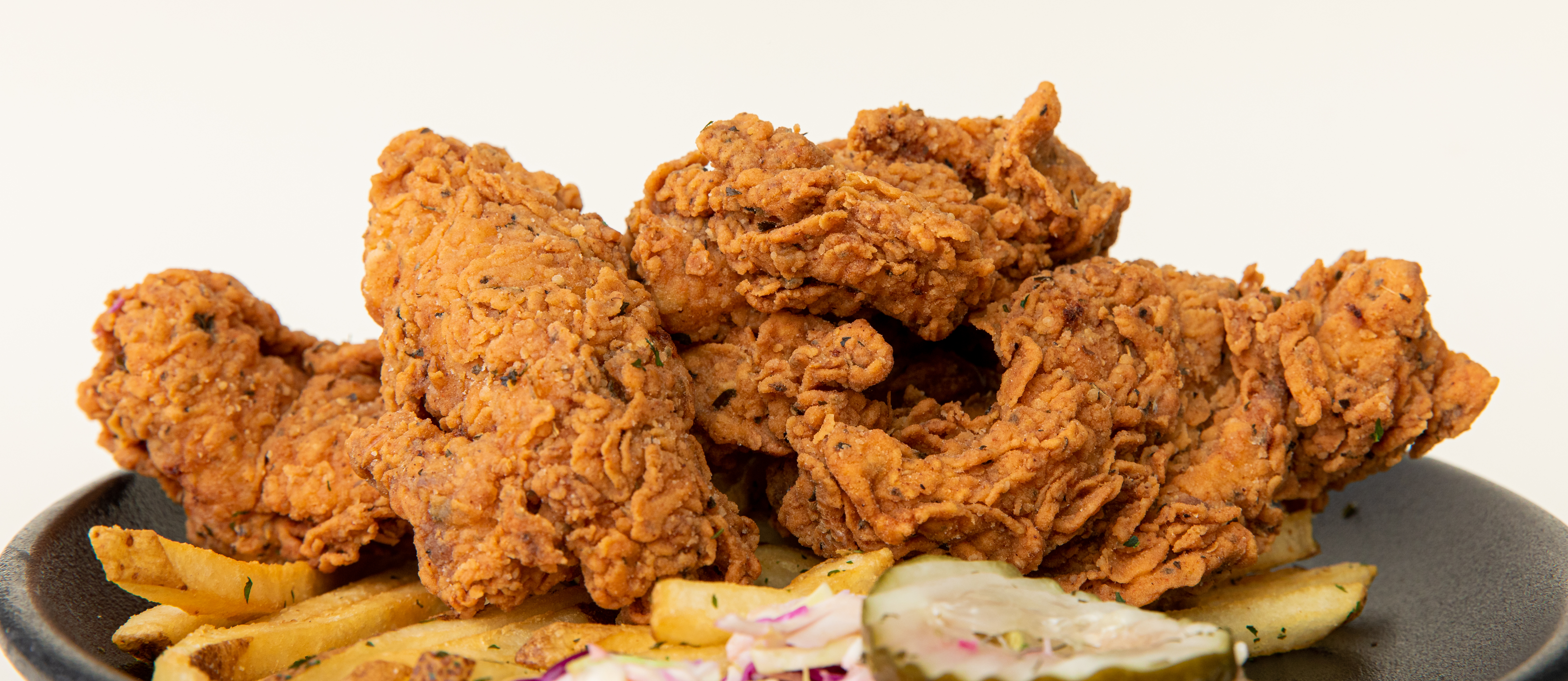 12 pieces, pickles, shoestring fries, slaw w/ garlic mayo