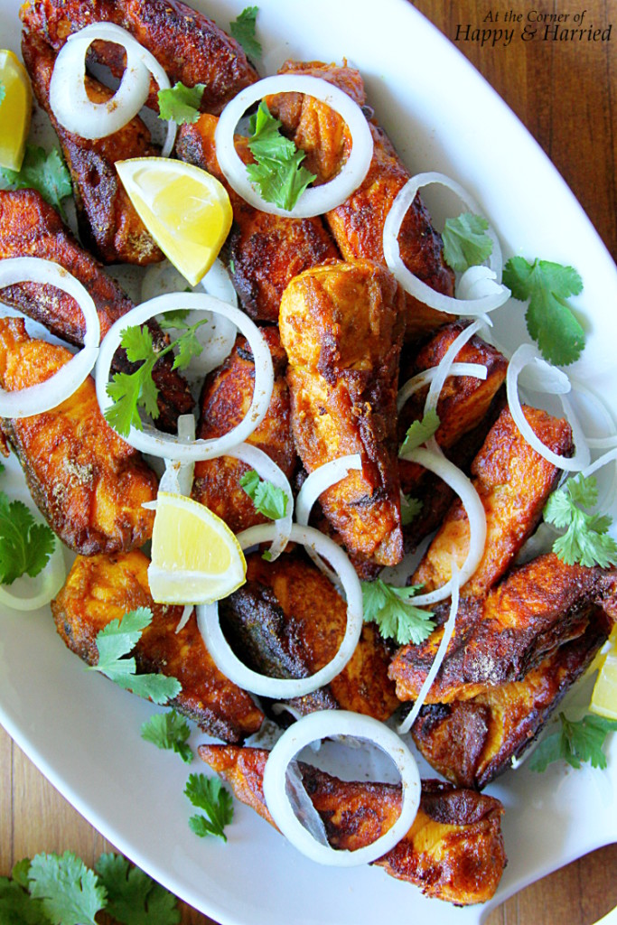 Snapper fish marinated in yoghurt with garlic, ginger paste and spices, cooked in tandoori oven.