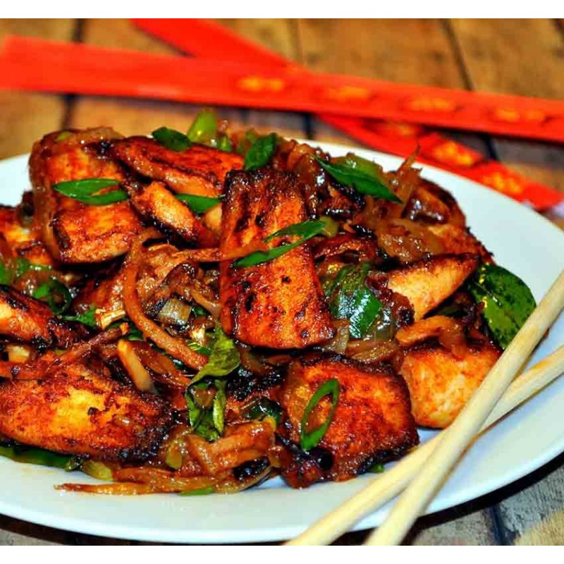 Homemade deep COTTAGE CHEESE CUBE PIECES cooked with onion and capsicum touch with soya sauce. Garnished with spring onion.